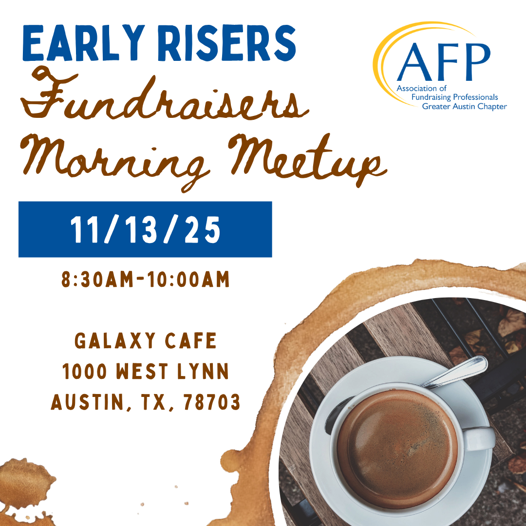 Early Risers Fundraisers Meet Up Start your morning with good coffee and great company! Join fellow fundraisers for an informal gathering focused on connection, conversation, and community. Whether you're new to the field or a seasoned pro, this is a relaxed space to share ideas, swap stories, and build relationships that lift us all. Coffee’s on you but the community is on us! RSVP is not required but appreciated. Email [email protected] to RSVP! Contact: [email protected] |