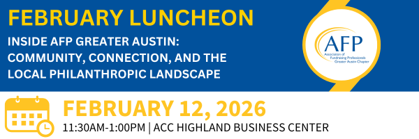 AFP Greater Austin invites you to a networking lunch focused on what’s next for the fundraising community in 2026. AFP Greater Austin Executive Director Jayden Beatty will outline the Chapter’s priorities for the year ahead, highlight the many ways fundraisers, nonprofit leaders, and community partners can plug in and benefit from AFP’s resources, and share data based insights into the philanthropic landscape.