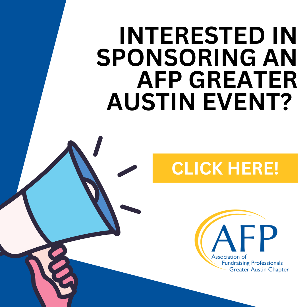 AFP Greater Austin Chapter Sponsor and Partnership OpportunitiesSince 1986, AFP Greater Austin has supported fundraising professionals, nonprofit leaders, donors, and community leaders through high-quality education, meaningful connection, and leadership development. This work is made possible by the generosity of partners who recognize the importance of a strong, resilient nonprofit sector. We are deeply grateful to those who have supported our Chapter and helped ensure that fundraisers across our region can grow, thrive, and continue their vital work. As we look ahead, we invite you to consider sponsoring AFP Greater Austin throughout the year. Year-round sponsorship provides consistent support for the professionals who sustain our sector while offering meaningful visibility and engagement opportunities for our partners across multiple programs and events. We encourage you to explore our 2026 sponsorship opportunities and welcome the chance to connect about custom sponsorship packages. These tailored options allow partners to create impact across multiple events while aligning benefits with each sponsor’s goals and values. If you’re interested in learning more or securing a sponsorship opportunity, please contact AFP Greater Austin’s Executive Director, Jayden Beatty, at [email protected].